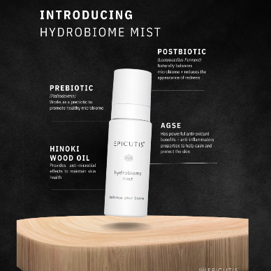 EPICUTIS® Hydrobiome Mist utilizes the naturally occurring postbiotic, Lactobacillus and Maltodextrin as a prebiotic to promote healthier skin without preservatives and other unnecessary, skin damaging ingredients. Highlighted by technology developed at Princeton University, proprietary ingredient Activated Grape Seed Extract (AGSE) formulated with Hinoki Wood Oil, boosts skin hydration and barrier function, while providing anti-microbial andantioxidant properties to protect the skin.